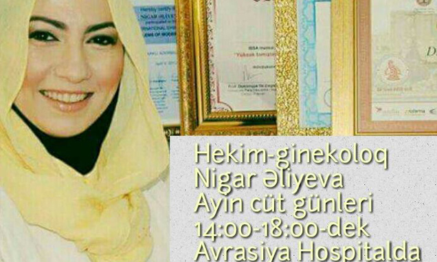 Mamalıq - Ginekologiya bölümü, Qadın xəstəlikləri - Doğum sahələri üzrə Türkiyə Qazi Universitetindən mütəxəssislik qazanan Həkim Mama - Ginekoloq Dr.Nigar Əliyeva artıq Avrasiya Hospitalda sizlərin xidmətinizdədir. Dr.Nigar Əliyeva - Azərbaycan Səhiyyə Nazirliyi və eyni zamanda xarici ölkələrdə təşkil edilən Ginekoloji xəstəliklər, Hamiləlikdə aktual problemlər, Sonsuzluq mövzularında beynəlxalq dərəcəli konfrans və simpoziumlarda iştirak edərək Mamalıq Ginekologiya sahəsi üzrə yüksək təcrübəsini sübut edən müxtəlif diplomlarla təltif edilmişdir. Bakterial vaginoz, Hamiləlik - Urogenital infeksiyalar və s. mövzularında bir çox elmi məqalələrin müəllifidir. 2006 - cı ildən indiyədək Qadın Məsləhətxanasında Həkim - Ginekoloq olaraq fəaliyyət göstərməkdədir.